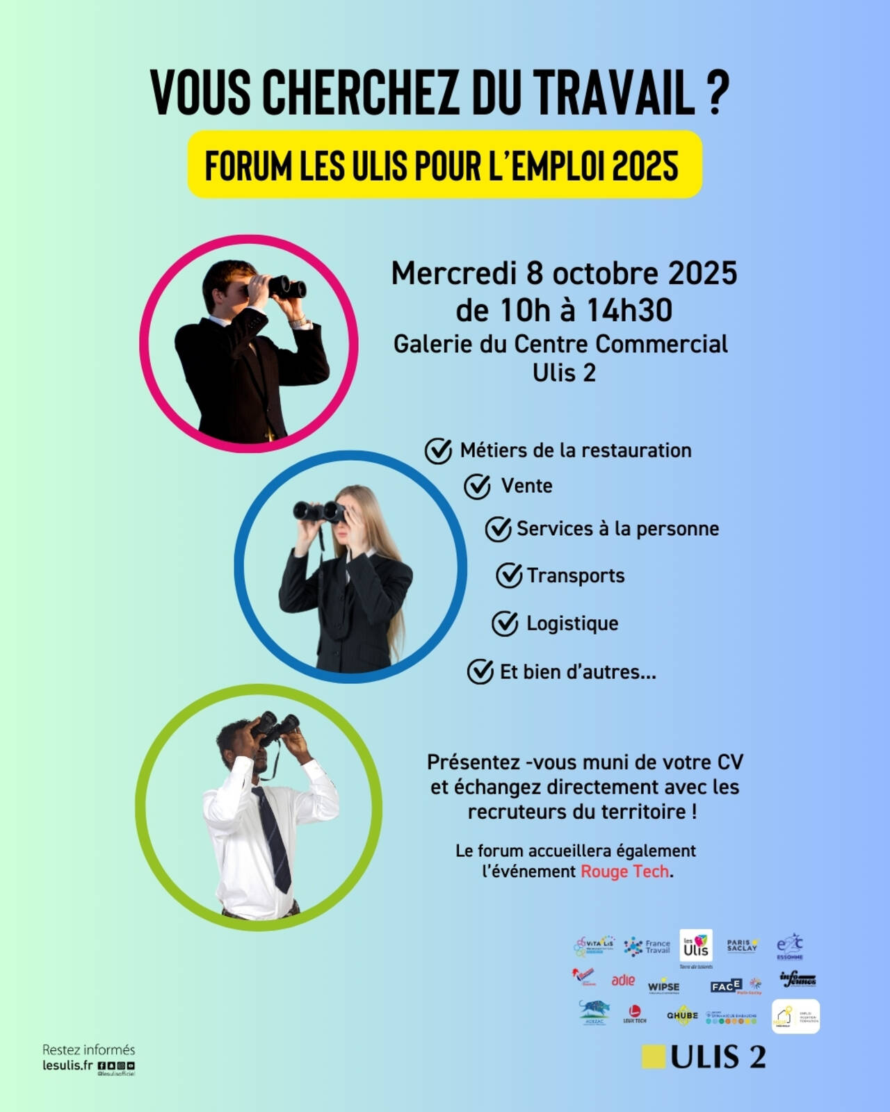Le mercredi 8 octobre prochain, de 10h à 14h30, le Centre Commercial ULIS 2 en partenariat avec la mairie des Ulis organisent un forum de l’emploi. Venez découvrir les entreprises locales qui recrutent !