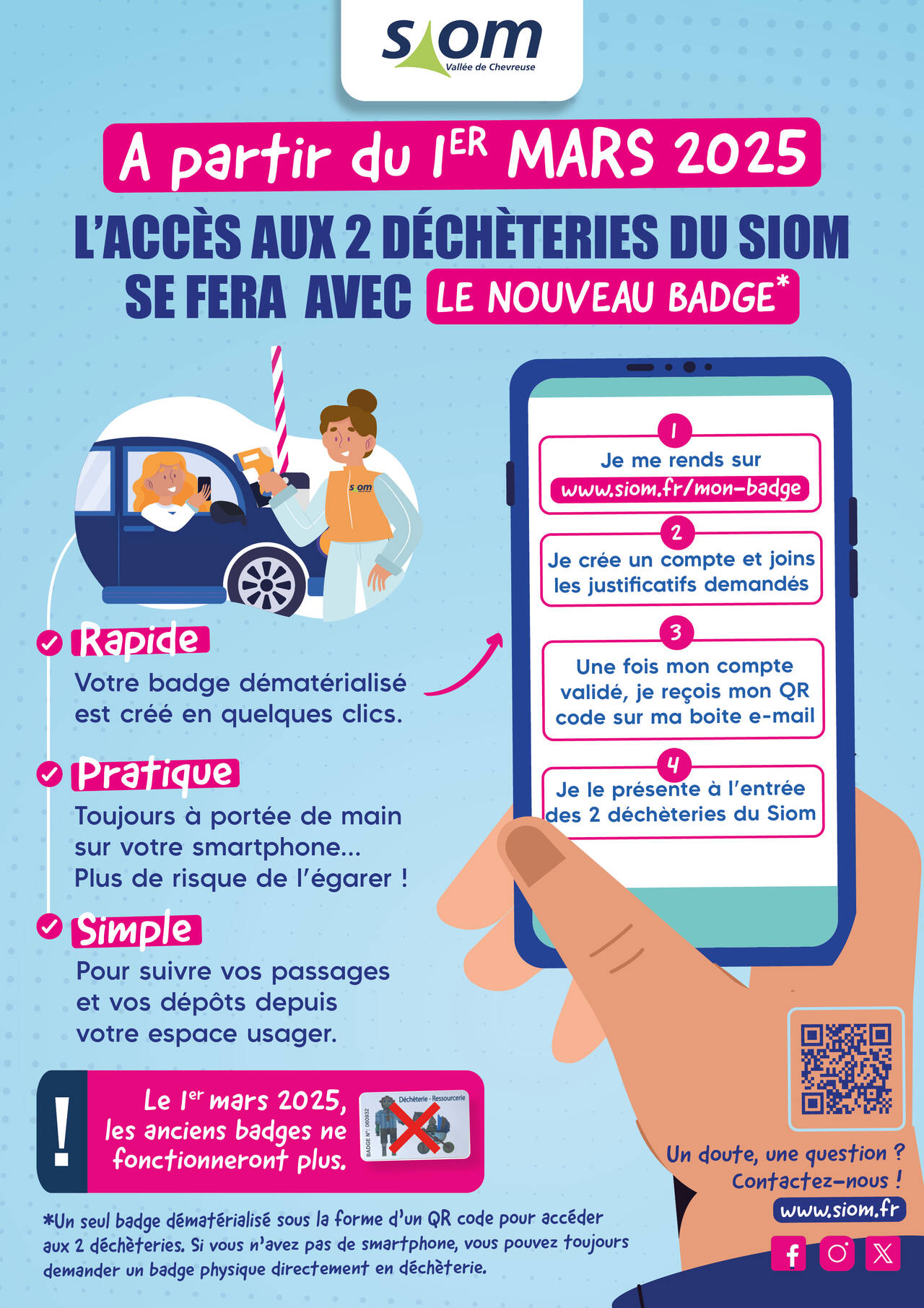 Dès le 1er mars, l'accès aux déchèteries du Siom situées à Saclay et Villejust se fera avec un badge dématérialisé sous forme de QR code, accessible directement depuis votre smartphone.