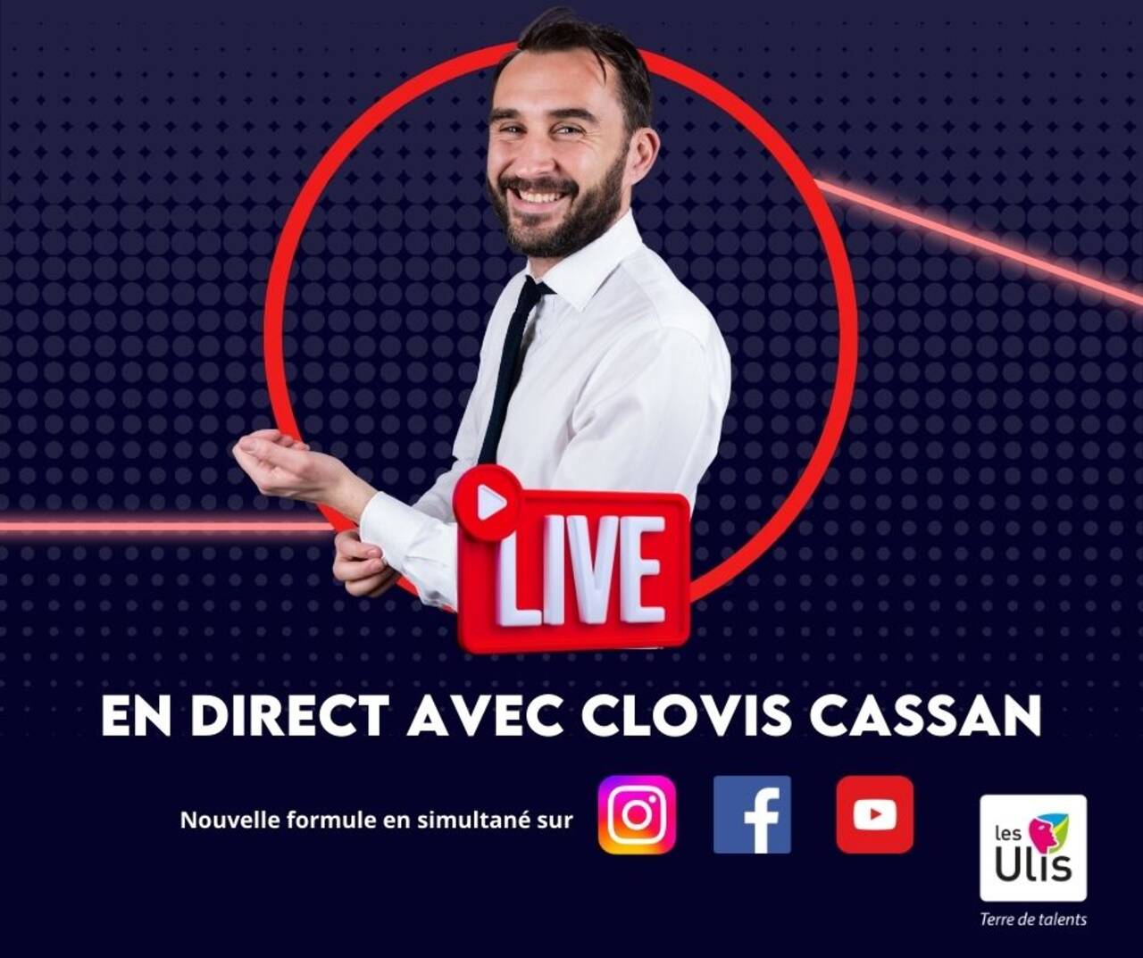 Informations pratiques Dates passées Jeudi 16 octobre 2025 - 19h Sur Facebook, Instagram et YouTube @lesulisofficiel EN DIRECT AVEC CLOVIS CASSAN c'est jeudi, préparez vos questions. Rendez-vous jeudi 16 octobre à 18h30 pour le traditionnel "En direct avec Clovis Cassan"À suivre sur Facebook mais aussi sur Youtube et sur Instagram Localiser Sur Facebook, Instagram et YouTube @lesulisofficiel