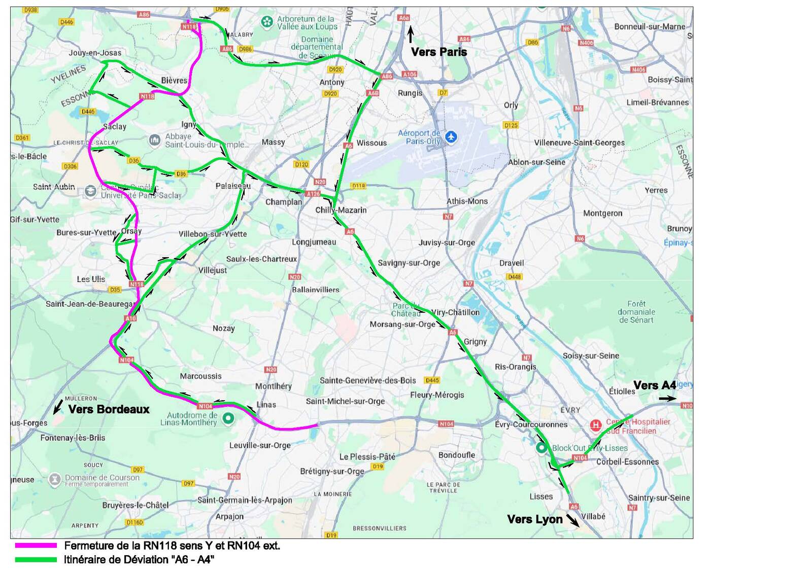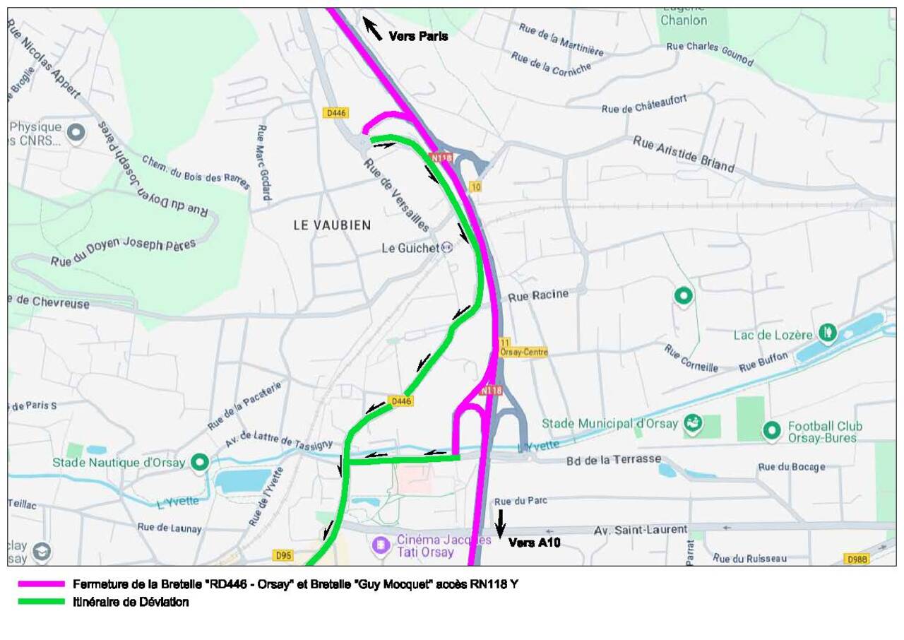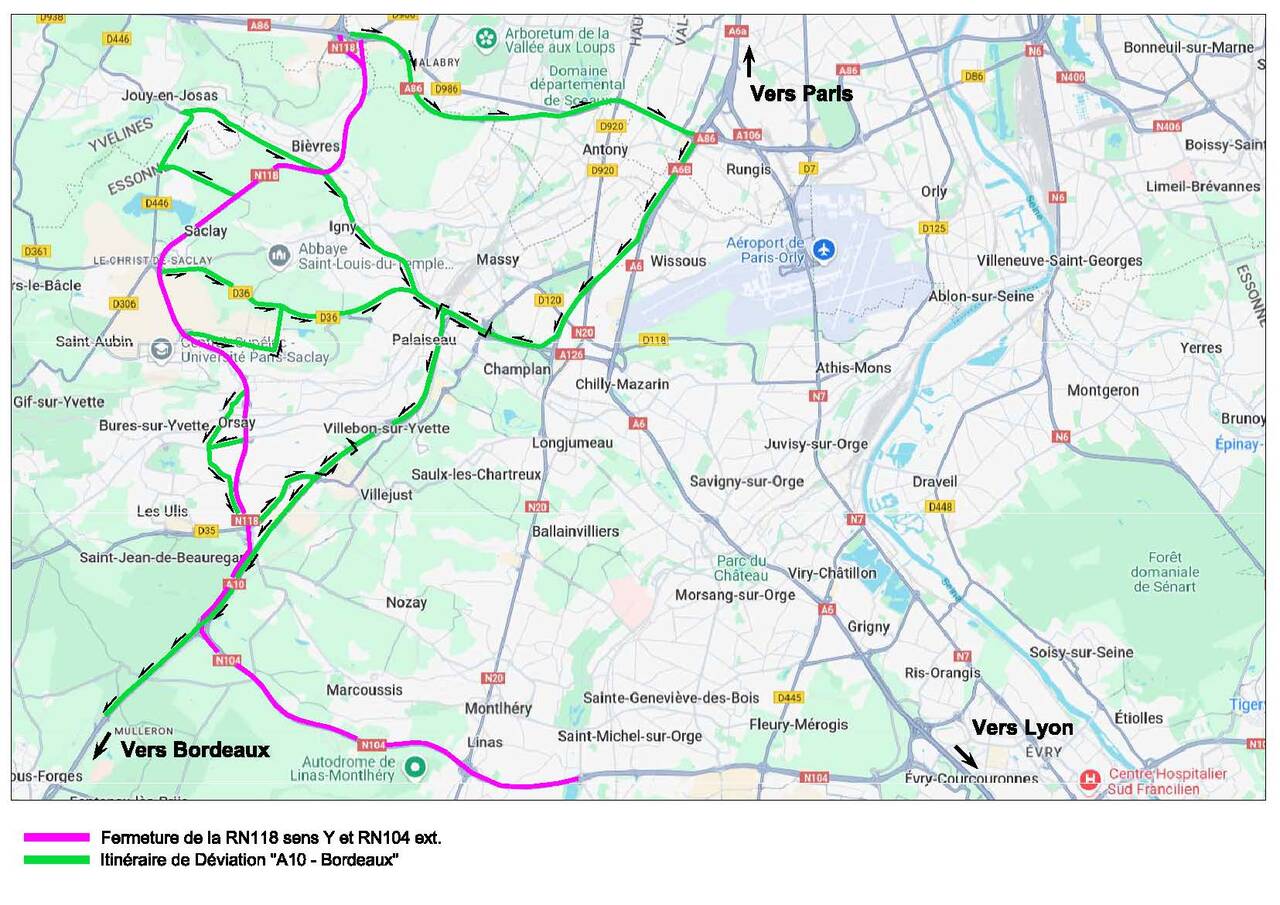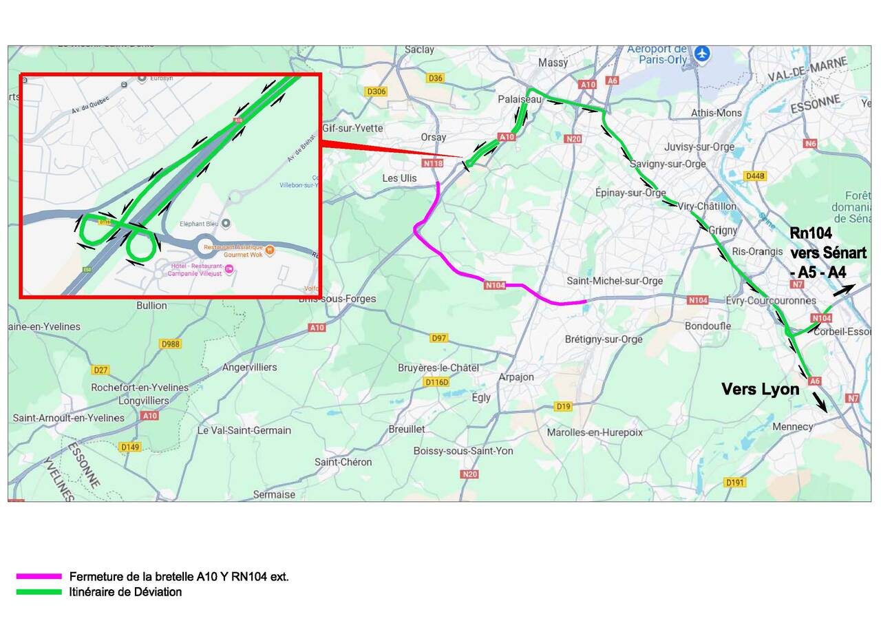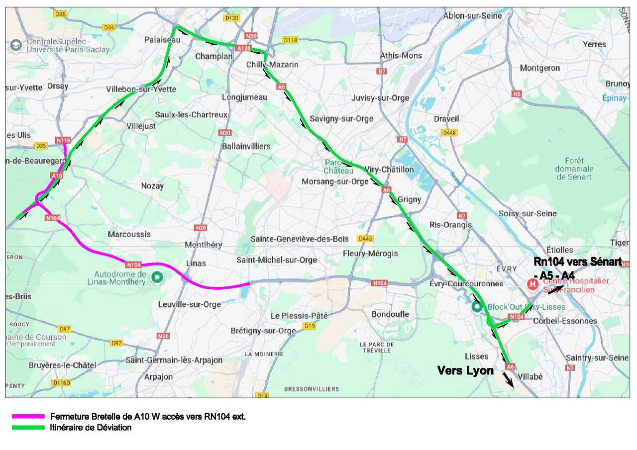 Pour permettre la réalisation des travaux d'entretien, de réfection de chaussées et de sécurité, la RN 118 et la RN 104 sont interdites à la circulation du lundi 13 octobre 2025 au vendredi 17 octobre 2025 chaque nuit, de 21h30 à 05h00.