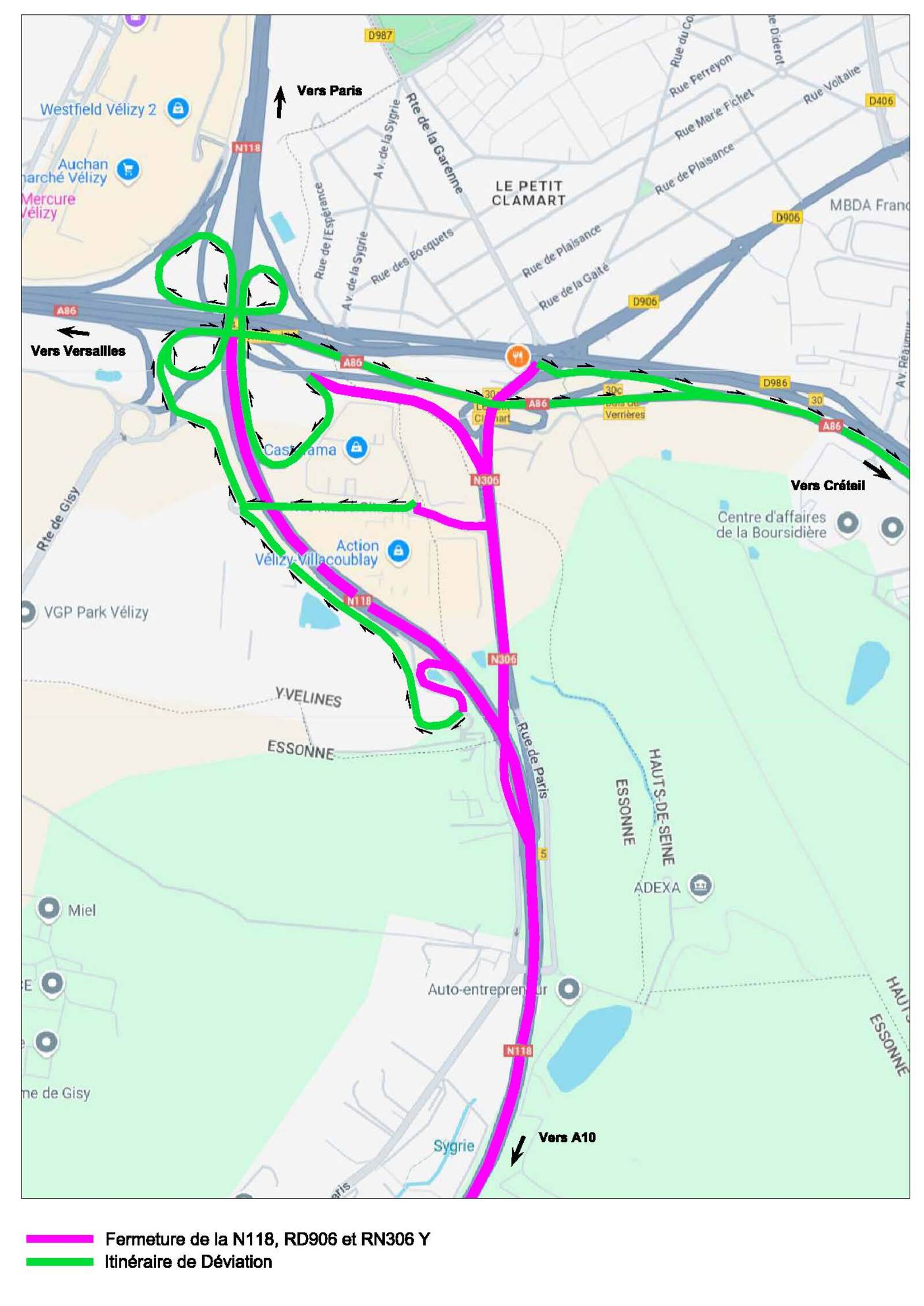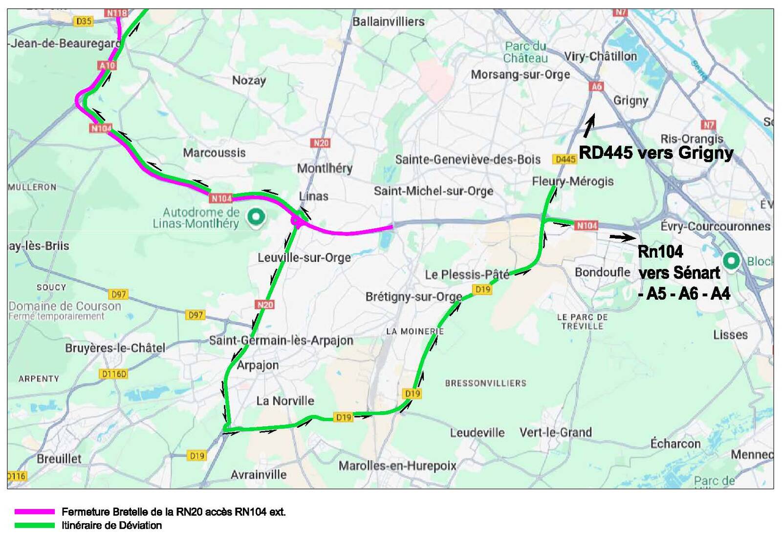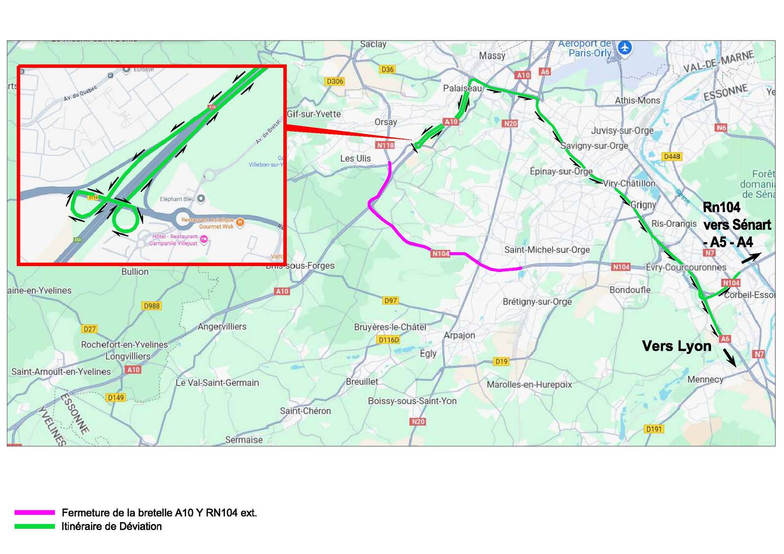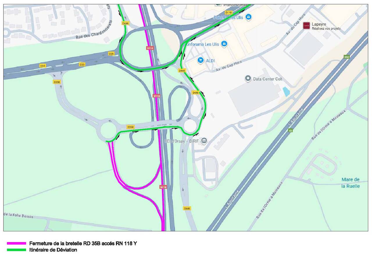 Pour permettre la réalisation des travaux d'entretien, de réfection de chaussées et de sécurité, la RN 118 et la RN 104 sont interdites à la circulation du lundi 13 octobre 2025 au vendredi 17 octobre 2025 chaque nuit, de 21h30 à 05h00.